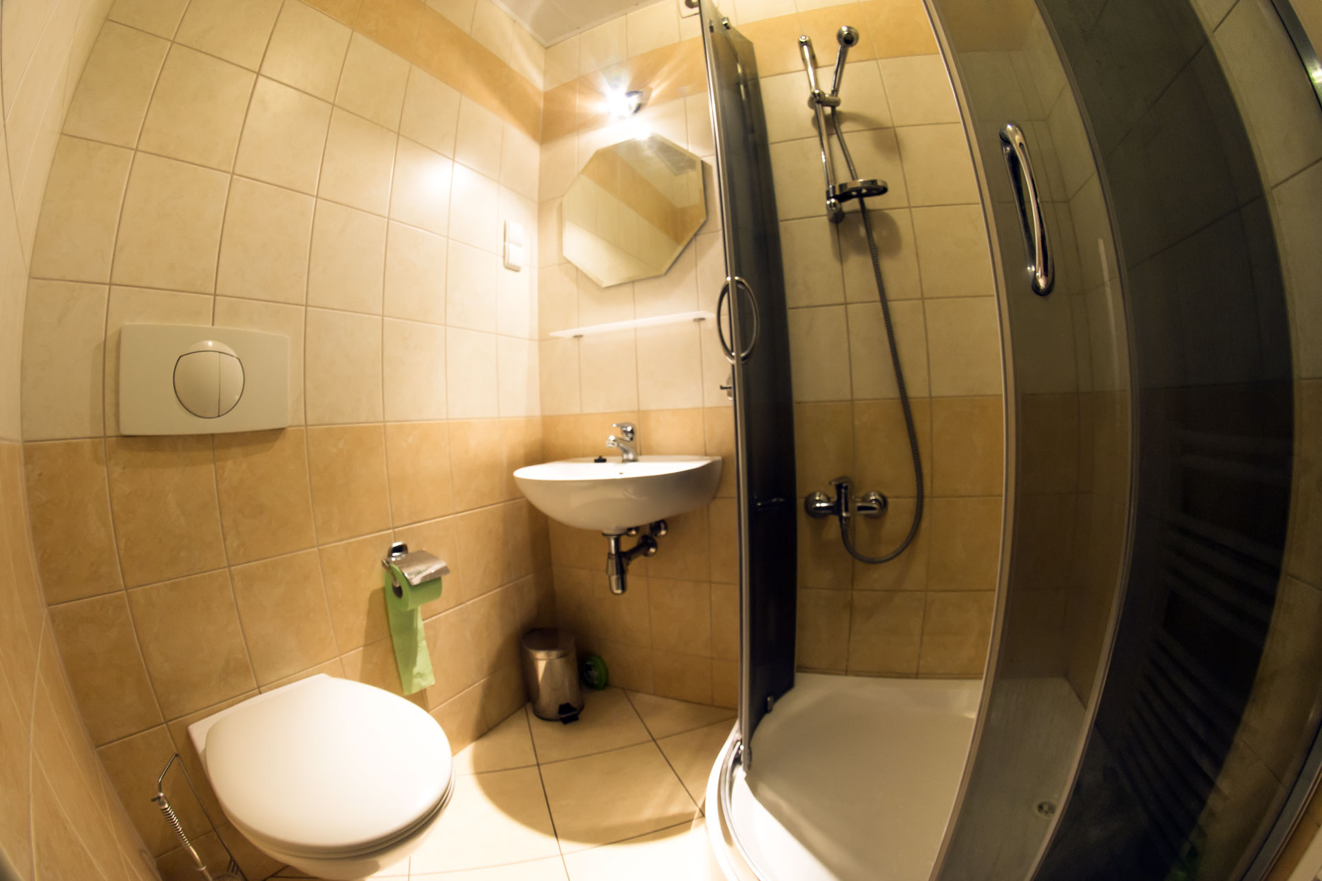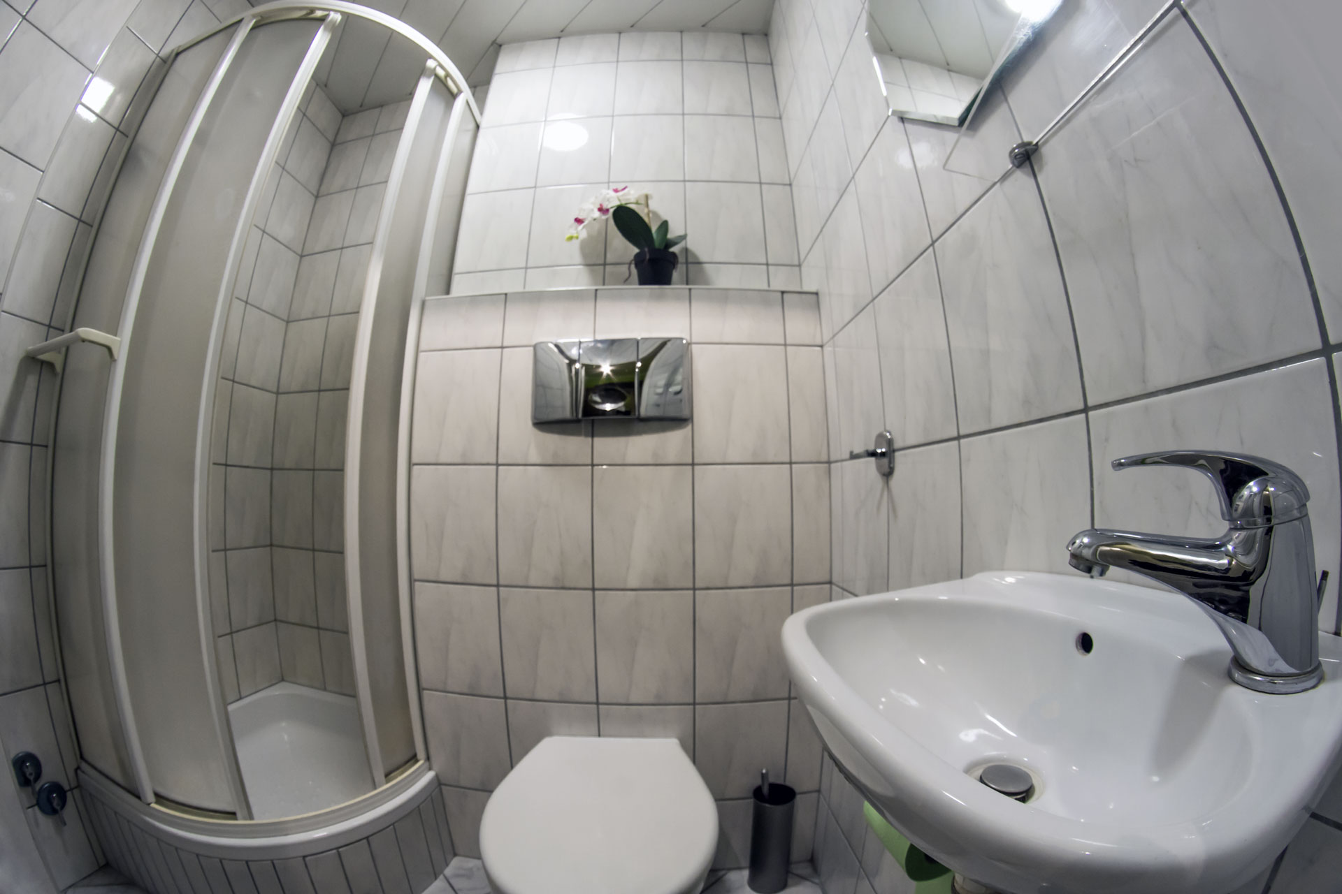 badeværelse, bruser, håndvask, toilet og internetadgang.
